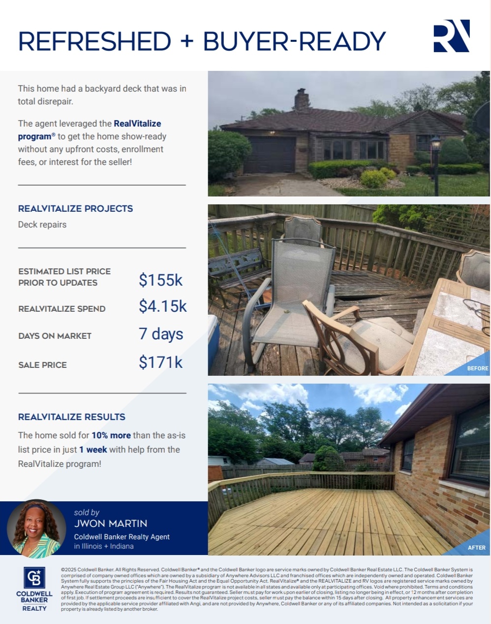 When selling a home, small changes can make a real impact. Through the RealVitalize program, you can access Angi’s network of trusted professionals which offers more than 500 types of services nationwide. With no fees or interest, you can enhance your home without incurring any upfront costs.* Upgrade effortlessly with the RealVitalize program!